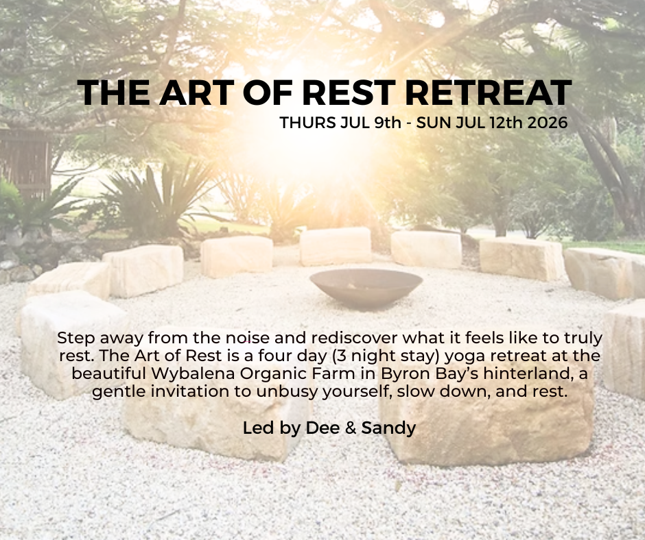 Step away from the noise and rediscover what it feels like to truly rest. The Art of Rest is a four-day yoga retreat at the beautiful Wybalena Organic Farm in Byron Bay’s hinterland , a gentle invitation to unbusy yourself, slow down, and restore.